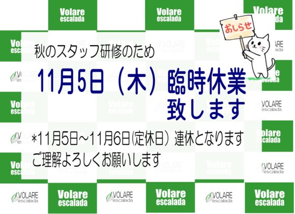 2020.10.29 / 最終更新日時 : 2020.10.29 volare-escalada Information 【お知らせ】臨時休業します 毎年恒例の秋のスタッフ研修のため、11月5日(木)お休みします。 定休日の6日(金)と連休になります。 ご理解よろしくお願いします。 Follow me! @volareescalada 関連 FacebookXBlueskyCopy