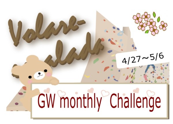 もうすぐ、ゴールデンウィーク!GWスペシャル企画で、GWマンスリーチャレンジ~5月のマンスリーを女性6課題、男性12課題登れたらボラーレオリジナル缶バッジをプレゼント!