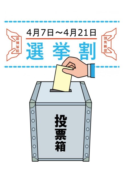 2019.4.2 / 最終更新日時 : 2019.4.2 volare-escalada Information 今年も選挙割やります 第19回全国統一地方選挙が4月7日(前半)と4月21日(後半)にあります。ボラーレ・エスカラーダでは、7日から2週間の間、「選挙割」を行います。 選挙当日、お出かけの方は是非、期日前投票を。 当日投票の方も期日前投票の方も「投票済み証明書」をもらってください。 「投票済み証明書」をご提示していただくと施設使用料金が200円オフになります。平日の時間帯別料金も対象です。 *「投票済み証明書」は投票が終わった後で申し出れば簡単にもらえます。 Follow me! @volareescalada 関連 FacebookXBlueskyCopy