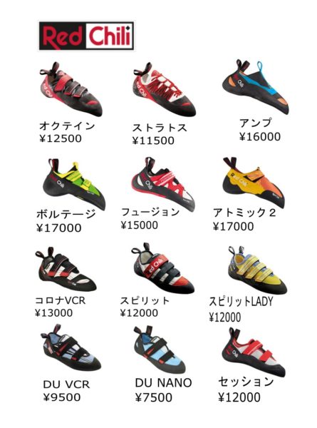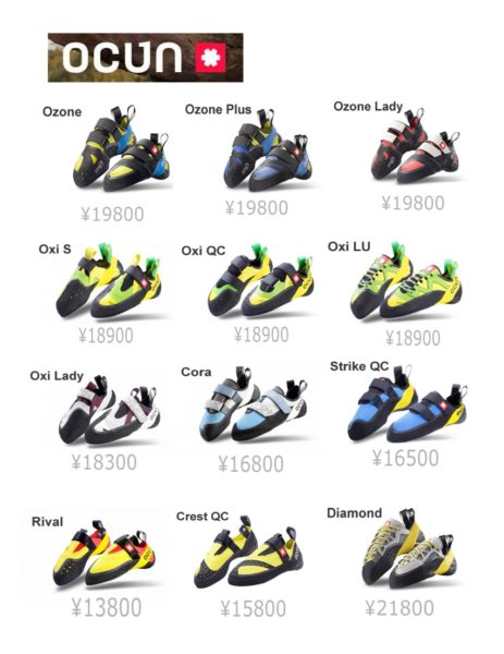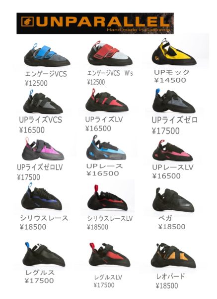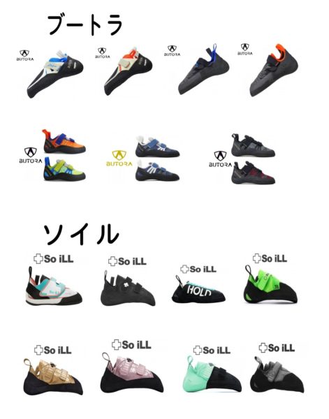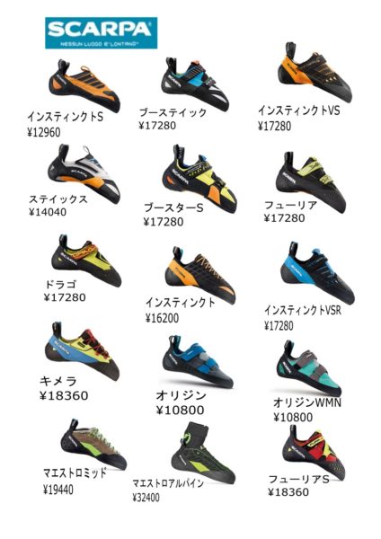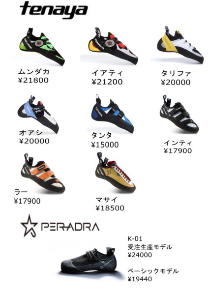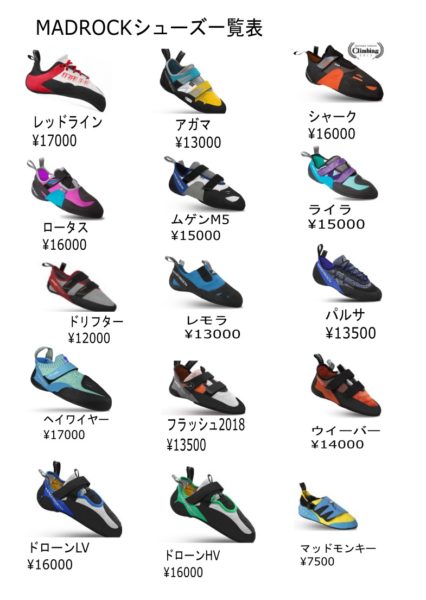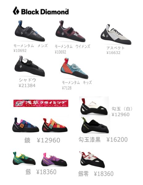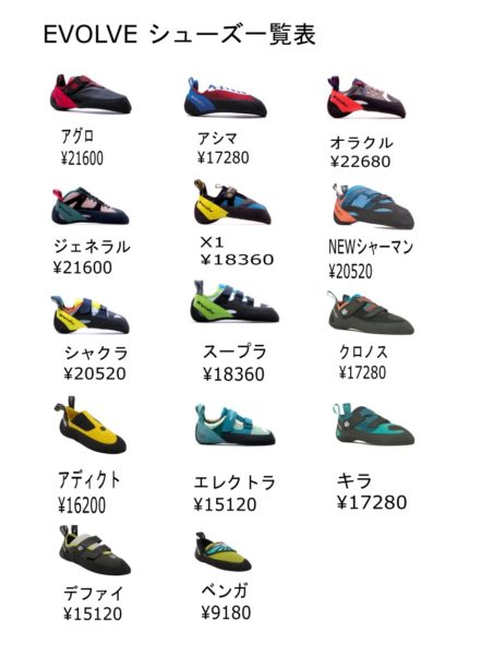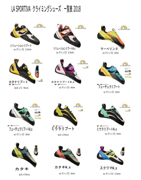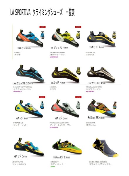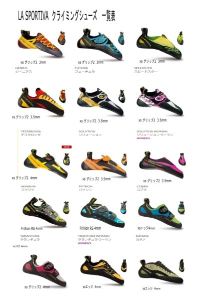 各メーカー別に、クライミングシューズの一覧表を作りました。